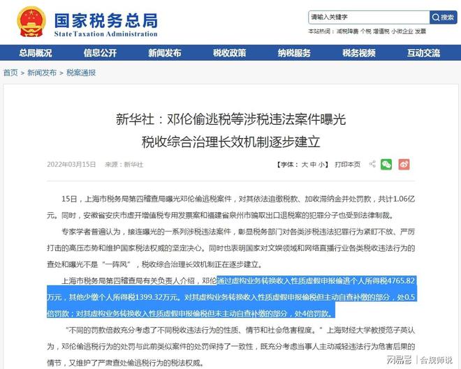 發布時間: 2022-03-29 來源:未知 浏覽:次克日,上海市稅務局第四稽察局暴光了一明星偷逃稅變亂,對該明星依法追繳稅款、加收滞納金并懲罰款,總計1.06億元。(數據濫觞于:國度稅務總局)