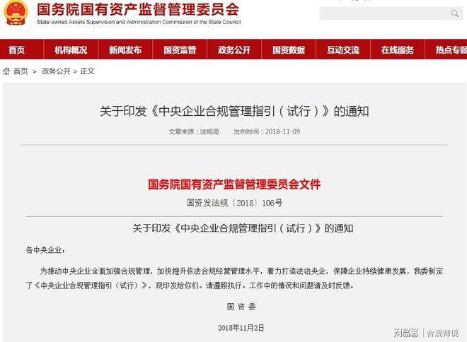 在企業合規變革曆程中,部門中心企業就被拿來作為變革試點。2018年11月9日,國資委公布了關于印發《中心企業合規辦理指引(試行)》的告訴。
